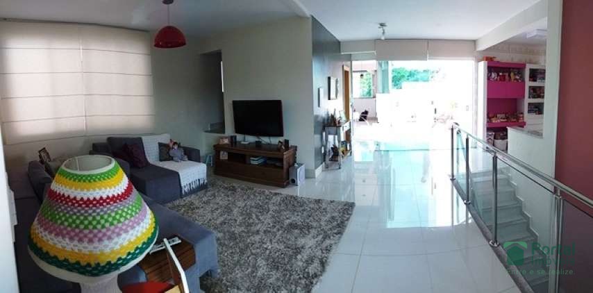 2° pavimento: 1 sala de TV com painel e piso em porcelanato, banho social com bancadas em granito e armários, espaço para depósito.