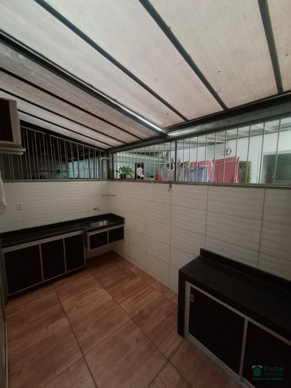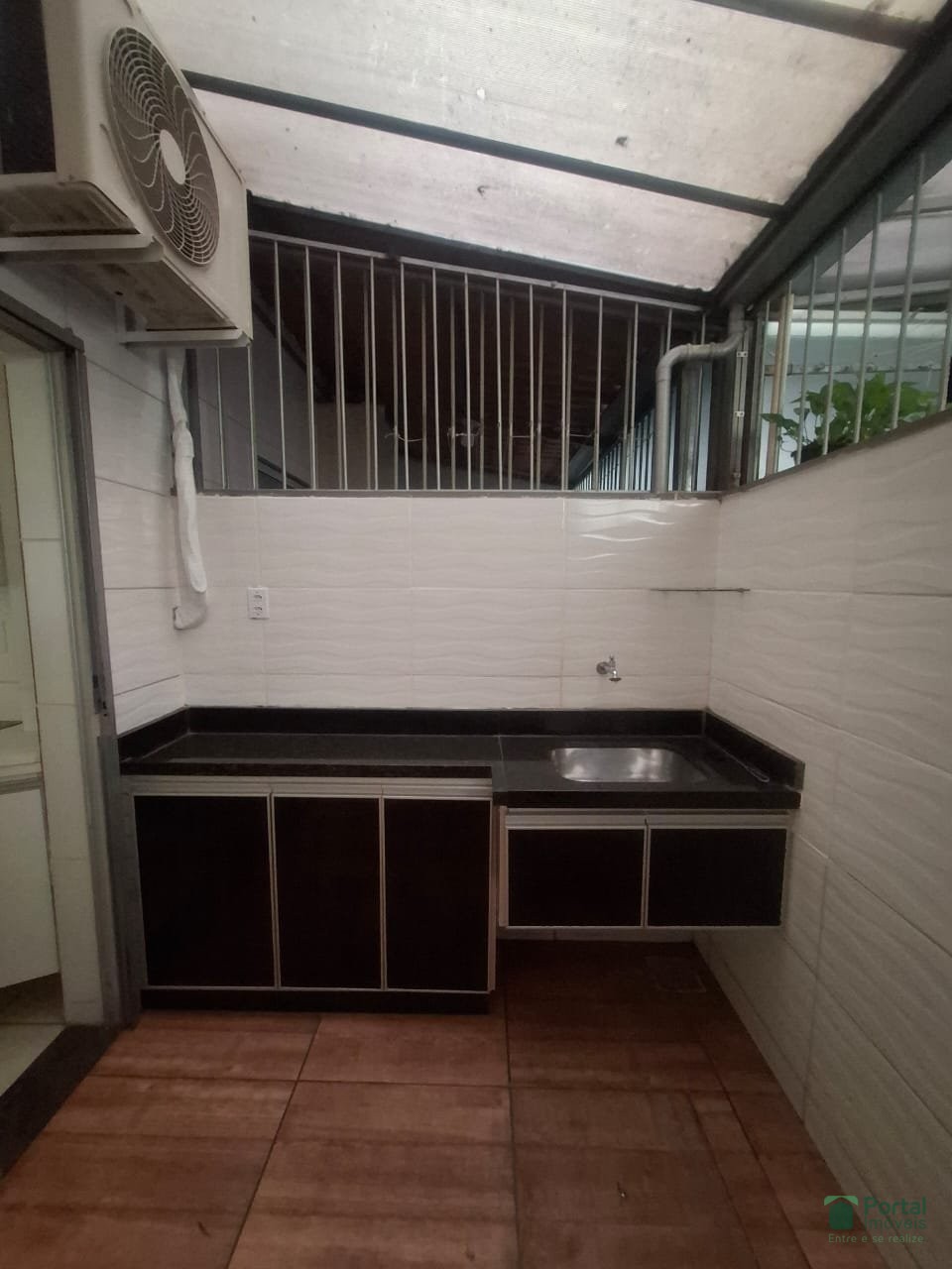 - área de serviço com bancada e fechamento, ar condicionado e telhado de recolher;
